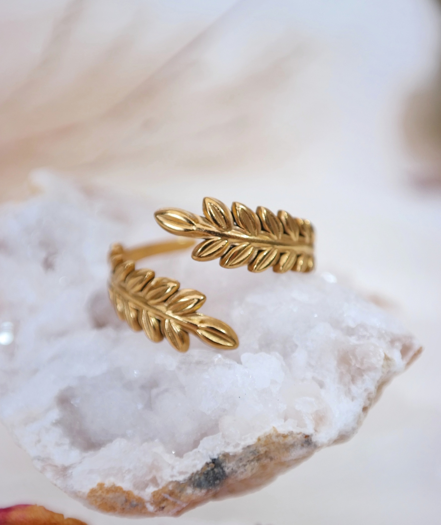 Ramo de Luz é um anel que nasce do encontro entre a natureza e o sagrado. Suas folhas douradas se entrelaçam como um ramo vivo, simbolizando crescimento, proteção e o florescer interior. Cada detalhe carrega a energia da luz que guia com suavidade, lembrando que a beleza verdadeira se revela nos gestos delicados e nos ciclos silenciosos da vida.